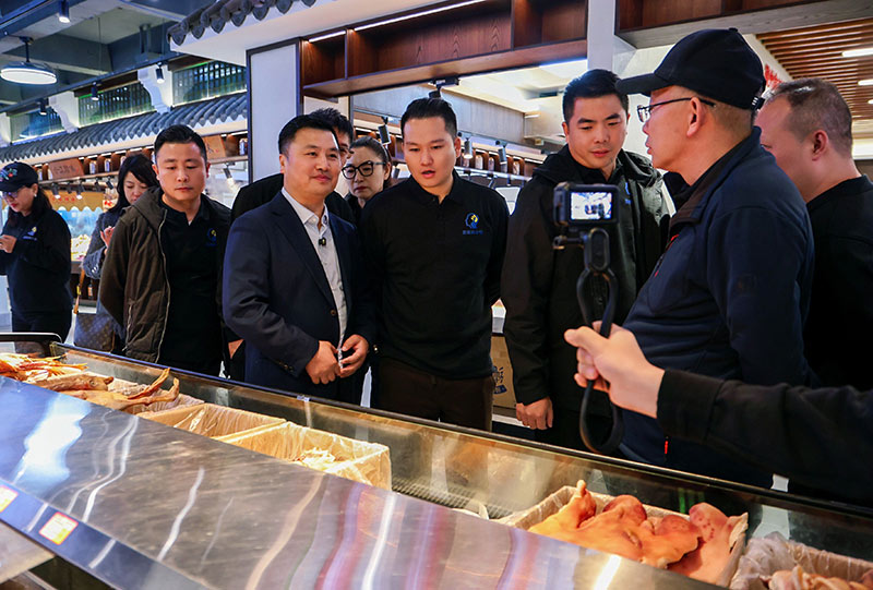 考察團(tuán)一行首先深入全江臘味智能化生產(chǎn)基地,實地察看標(biāo)準(zhǔn)化生產(chǎn)車間。董事長江禮明和總經(jīng)理胡國峰現(xiàn)場介紹核心產(chǎn)品的傳統(tǒng)工藝傳承,以及智能設(shè)備在品質(zhì)管控、產(chǎn)能提升中的應(yīng)用。隨后走進(jìn)全江臘味體驗店,那香氣撲鼻的臘肉、色澤誘人的臘腸,像是在列隊歡迎遠(yuǎn)道而來的客人。