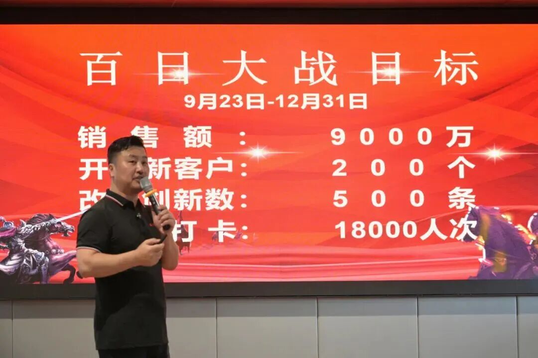 隨后,董事長江禮明正式發(fā)布百日大戰(zhàn)目標(biāo):實(shí)現(xiàn)銷售額突破9000萬元、開發(fā)新客戶達(dá)200個(gè),改善創(chuàng)新數(shù)500條、讀書打卡18000人次!